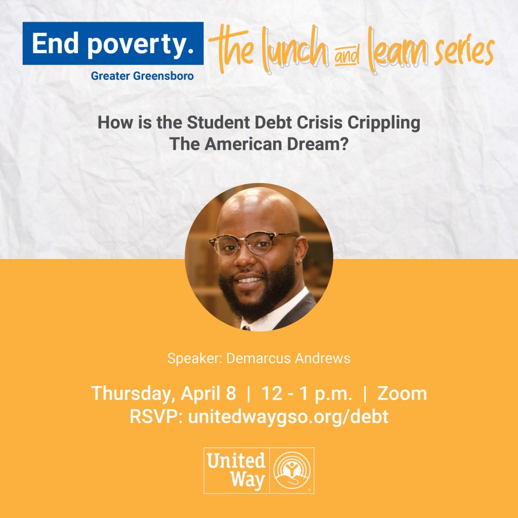 Greensboro, NC (March 22, 2021) – The public is invited to attend United Way of Greater Greensboro’s (UWGG) End Poverty: The Lunch and Learn Series on April 8, 12- 1 p.m., which will focus on overcoming the impacts of student debt. The free Zoom event, hosted by UWGG’s Young Leaders affinity group, will feature speaker Demarcus Andrews. Demarcus, NC Policy and Outreach Associate at the NC Center for Responsible Lending, will answer the question, “how is the student debt crisis crippling The American Dream?”